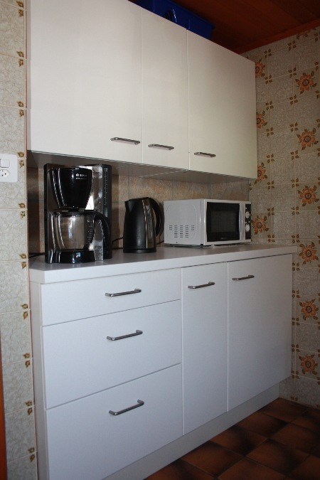 Küche mit Kochfeld, Spüle und  Kühlschrank